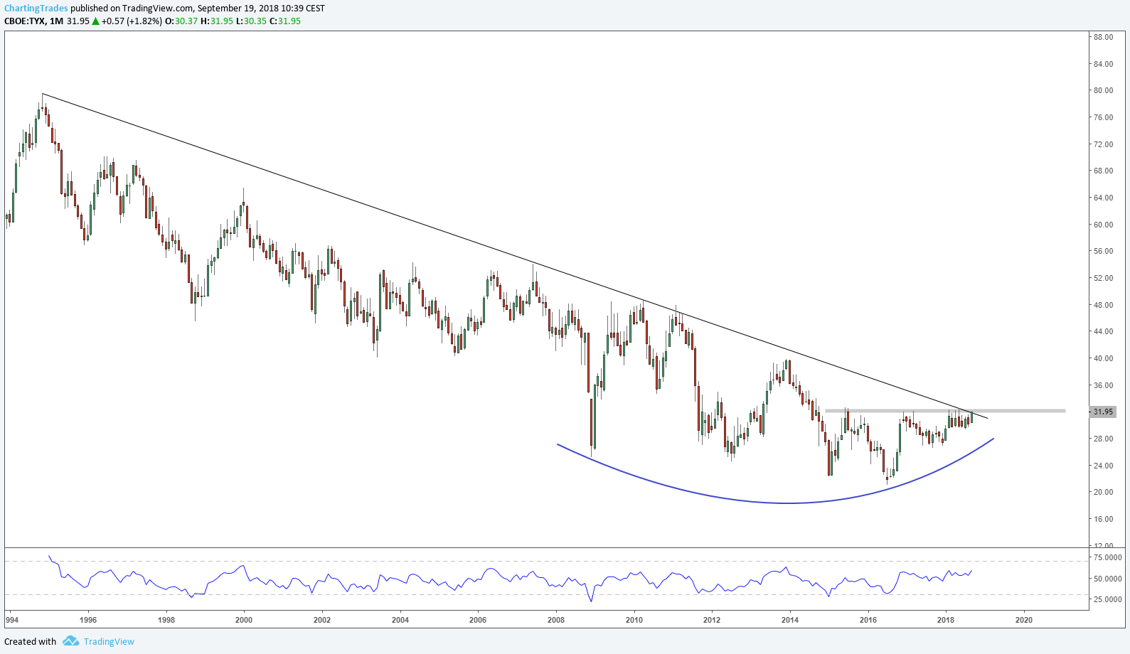 So, let me start with a monthly chart of 30 year yields $TYX. TYX is in a steady down trend. Hard to argue that. But what I would argue is that they’re trying to break above through a falling trend line and a resistance at 32.50. And start a new up trend.