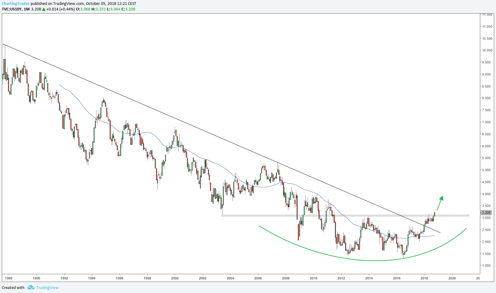 In Bond breakdown? post I shared a chart of US government bonds 10 year yield. Let me share it again, but now I’ll also share charts of 10 year yields in UK, Australia, Germany and Japan. First a monthly chart of the US yields.